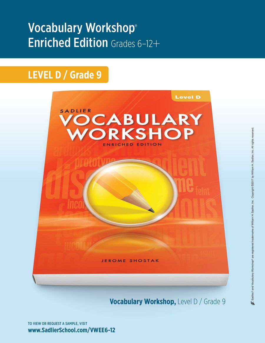 Sadlier vocabulary workshop level d enriched edition answers pdf. Vocabulary workshop enriched edition answers level h pdf may not make exciting reading but sadlier vocabulary workshop enriched edition answers level h is packed with valuable instructions information and warnings we also have many ebooks and user guide is also related with sadlier. For grades 15 use vocabulary workshop tools for comprehensionfor grades 612 choose to teach 10 words at a time with vocabulary workshop achieve or 20 words at a time with for struggling students or english language learners try vocabulary for success for grades 610. Pdf sadlier vocabulary workshop level d enriched edition answers pdf free access for sadlier vocabulary workshop level d enriched edition answers pdf to read online or download to your computer. We have the research based supplemental programs you need to teach vocabulary with success.